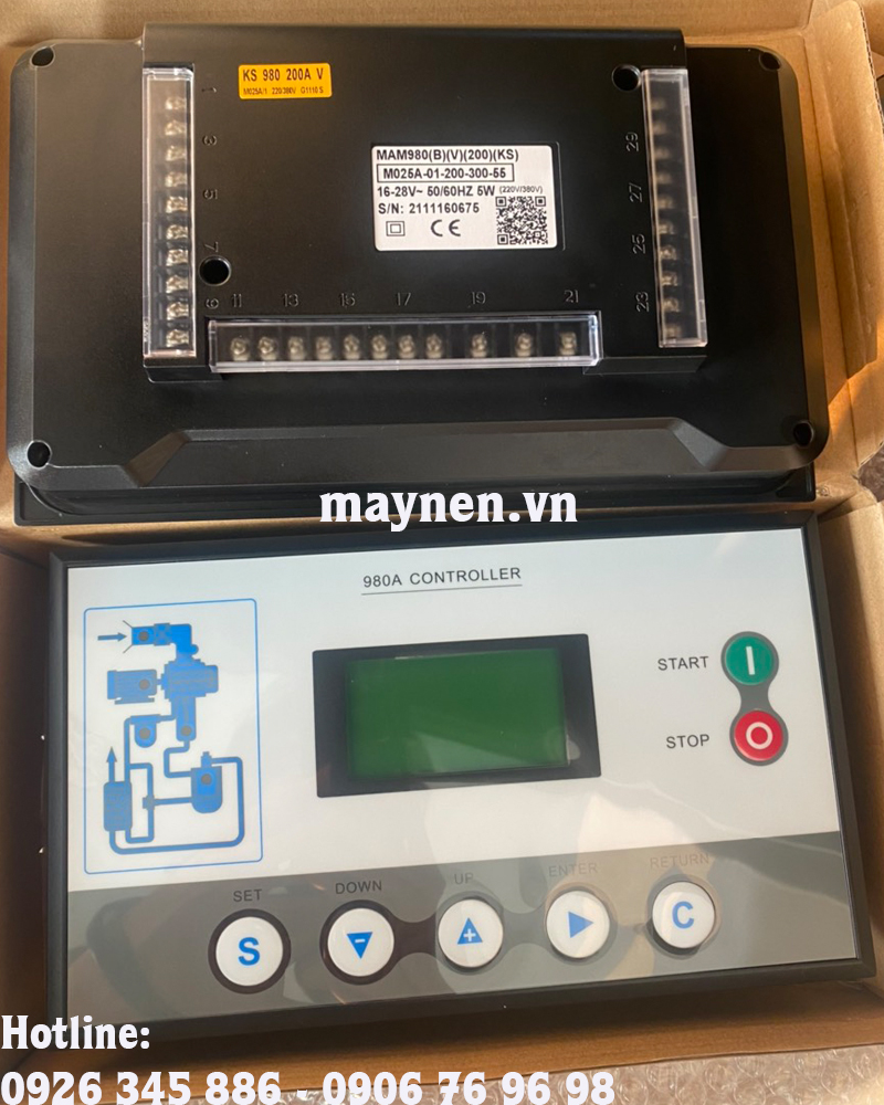 Bộ điều khiển máy nén khí, màn hình điều khiển, còn được gọi là bo điều khiển,…. là thiết bị điều khiển được lắp bên ngoài máy nén khí, có chức năng điều khiển, kiểm soát các thông tin của máy nén khí về công suất máy chạy, nhiệt độ của máy, nhiệt độ môi trường, áp suất khí nén, …