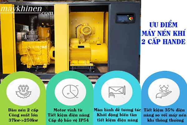 Cấu tạo máy nén khí 2 cấp cũng tương tự máy nén khí trục vít thông thường, chỉ khác là máy nén khí 2 cấp thì có 2 đầu nén (tham khảo hình ảnh đính kèm). Máy nén khí 2 cấp HANDE thường có công suất lớn, sử dụng đầu nén Hanbell AB (có 6 vòng bi), quạt hút ly tâm và sử dụng biến tần Inovance.
